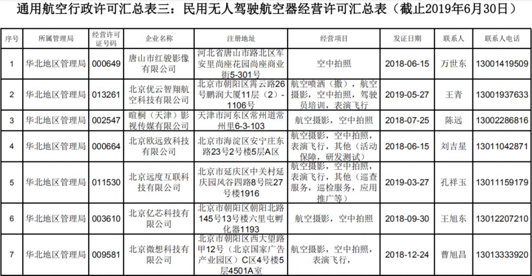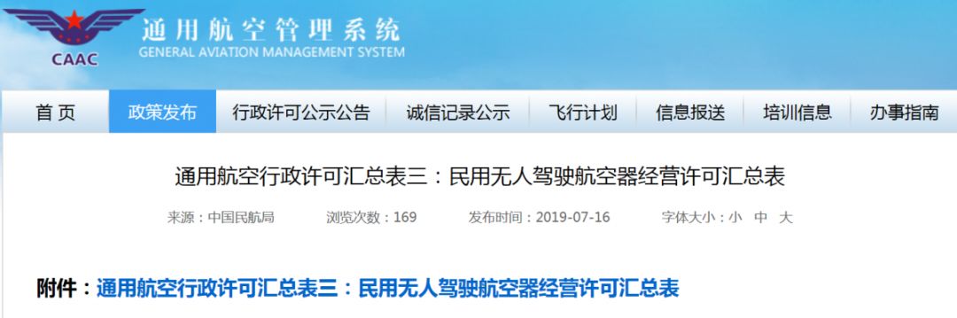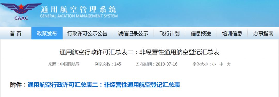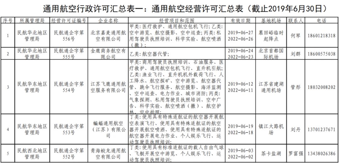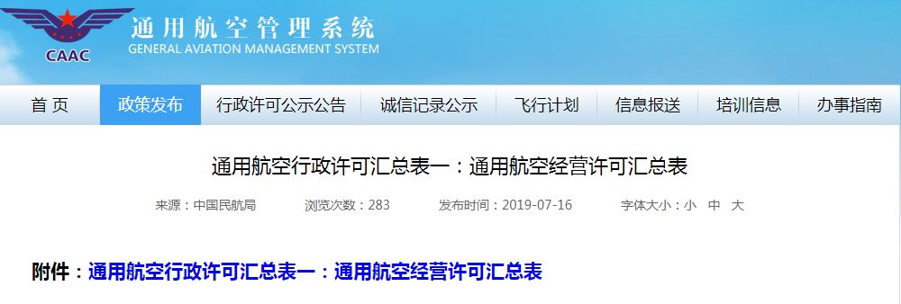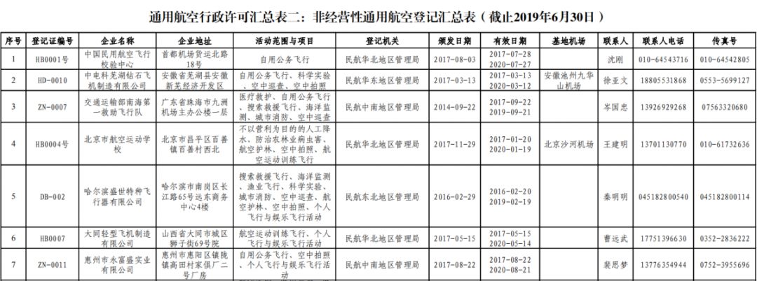 2019年7月16日,中国民用航空局通用航空管理系统发布了三项权威数据统计:《通用航空行政许可汇总表一:通用航空经营许可汇总表》、《通用航空行政许可汇总表二:非经营性通用航空登记汇总表》以及《通用航空行政许可汇总表三:民用无人驾驶航空器经营许可汇总表》。