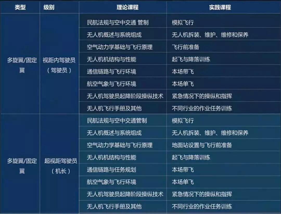 本次培训课程分2个等级,分别为轻型视距内(驾驶员)、轻型超视距(机长)。两个等级需要花费不同的费用及周期,可根据自身需求选择基础型或进阶型课程。